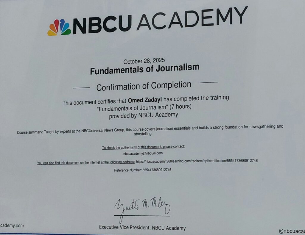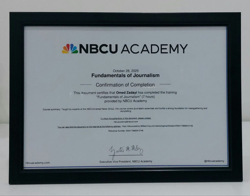 ڕۆژنامەنووس و وێنەگری ماڵپەڕی Sharazur Press ئومێد عەلی حسێن ناسراو بە (ئومێد زادەیی) بڕوانامەی نێودەوڵەتی متمانەپێکراوی لەلایەن کەناڵ و دامەزراوەی میدیایی NBC ئەمریکی پێبەخشرا، پاش زیاتر لە مانگێک ماندوو بوون و بەردەوامی لە بەشداریکردن لە خولێکی جیهانی و نێودەوڵەتی ٢٨ی ١٠ی ٢٠٢٥ ڕۆژنامەنووسی بە توانای قەزای شارەزوور ئومێد زادەیی بڕوانامەی پێبەخشرا، جێی باسە لە هەژماری فەیسبوکی ئومێد زادەیی تەواوی پڕۆسەکە و خول و بەشداریکردن ڕوون کراوەتەوە، هاوکات ئێمە وەکو دەزگای میدیایی شارەزوور پرێس پیرۆزبایی خۆمان ئاڕاستەی ڕۆژنامەنووس و وێنەگەری ماڵپەڕەکەمان دەکەین و هیوای سەرکەوتنی زیاتر دەخوازین بۆ بەڕێزیان.