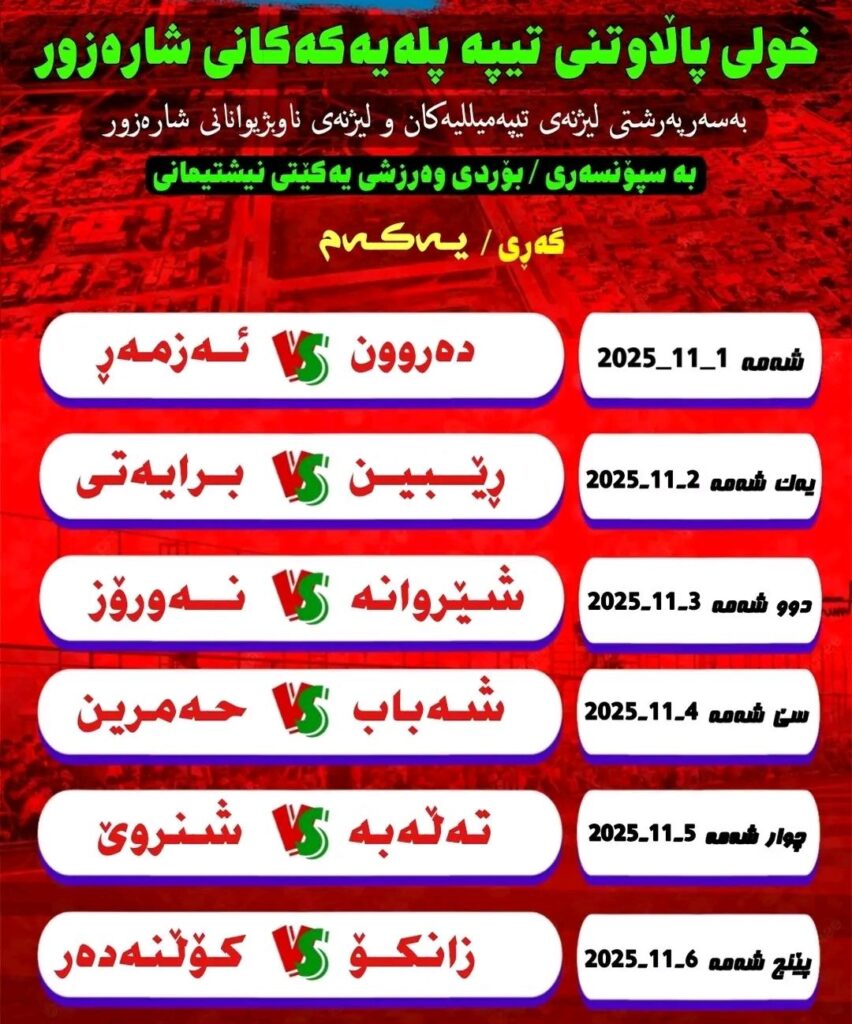 ئەمڕۆ یەکەمین گەڕی یارییەکانی خولی پاڵاوتنی تیپە پلە یەکەکانی شارەزوور بۆ وەرزی (٢٠٢٥-٢٠٢٦) دەست پێ دەکات. ئەم پاڵەوانێتییە بەسەرپەرشتی ڕاستەوخۆی لیژنەی تیپە میللییەکان و لیژنەی ناوبژیوانی شارەزوور بەڕێوە دەچێت و چواردە (١٤) یانەی بەهێز بەشداریان کردووە.