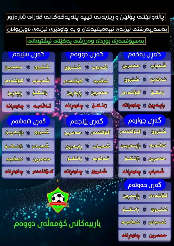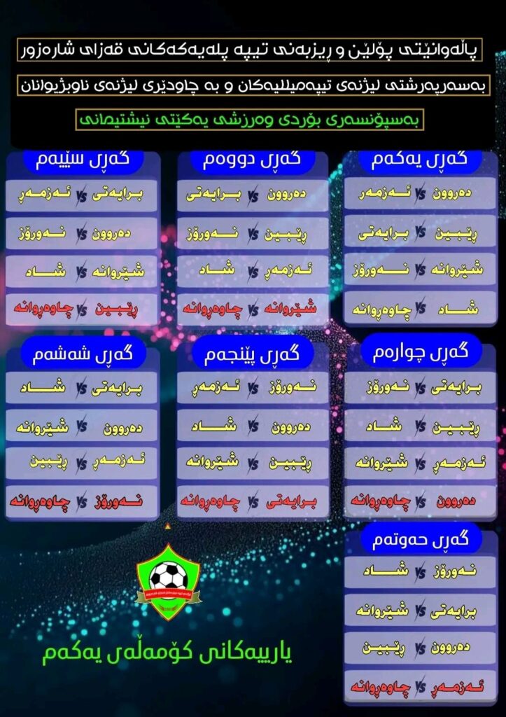 - دووشەممە (٣\١١): ڕووبەڕووبونەوەی نێوان یانەی شێروانه و یانەی نەورۆز.