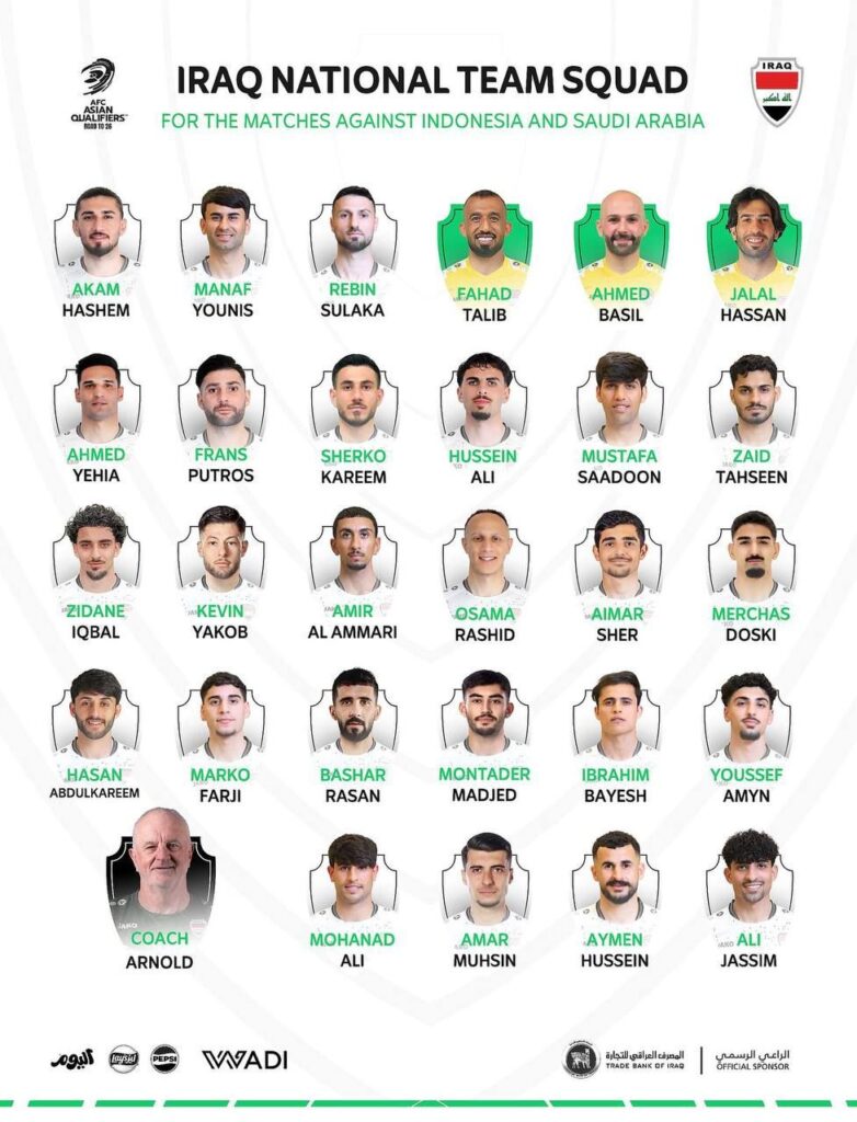 لە دەرەوەی وڵات، مێرخاس دۆسکیی یاریزانی ڤیکتۆریا پڵزنی چیکی، یوسف ئەمینی یاریزانی ئایک لارناکای قوبرسی، و مارکۆ فەرەجی یاریزانی ستڕۆمسگۆدسێتی نەرویجی، بەشێکن لەو یاریزانە پرۆفیشناڵانەی ڕاستەوخۆ لە ئەوروپاوە گەیشتوونەتە سعودیە. هەروەها لە یانە ناوخۆییەکانیش، شێرکۆ کەریم و ئوسامە ڕەشیدی یانەی زاخۆ، لەگەڵ ئاکام هاشمی یانەی زەورا، لە ڕیزی پێشەوەی یاریزانە گرنگەکانی عێراقن.